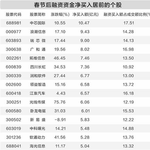 业绩表现方面,节后获得融资资金净买入超1亿元的个股中,普冉股份、中公教育、富临精工、科大智能、东方国信的2024年业绩预计扭亏。