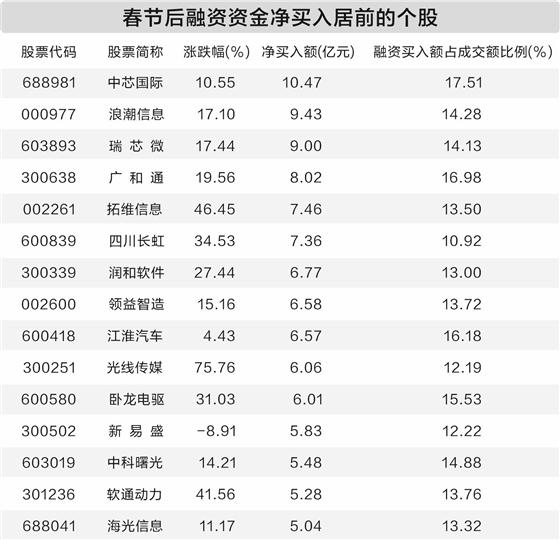 浪潮信息、瑞芯微、广和通、拓维信息、四川长虹的融资资金净买入额居前,均超7亿元。