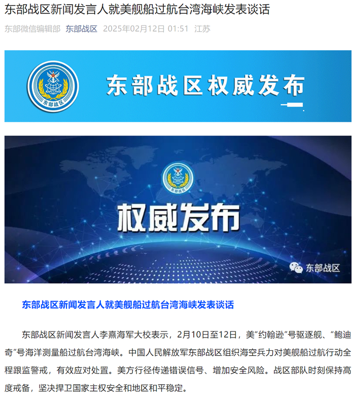 东部战区新闻发言人李熹海军大校表示,2月10日至12日,美“约翰逊”号驱逐舰、“鲍迪奇”号海洋测量船过航台湾海峡。中国人民解放军东部战区组织海空兵力对美舰船过航行动全程跟监警戒,有效应对处置。美方行径传递错误信号、增加安全风险。战区部队时刻保持高度戒备,坚决捍卫国家主权安全和地区和平稳定。