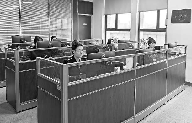 图一:陕西省市场监管局12315投诉举报指挥中心大厅内,工作人员在紧张地工作着。