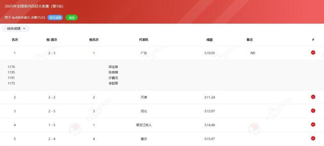 2月11日,在四川成都举行的2025年全国室内田径大奖赛第1站进入第二个比赛日争夺。广东队在男子4×400米接力比赛中以3分10秒05的成绩夺冠,打破该项目全国室内纪录。