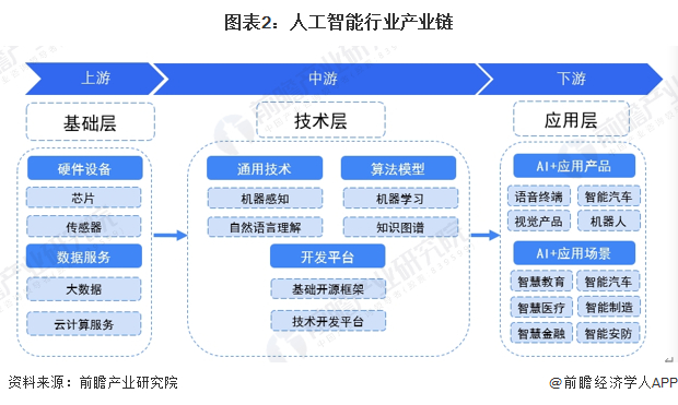 人工智能产业链上游为硬件设备和数据设备,其中包括芯片、传感器、大数据、云计算服务等,为人工智能提供数据服务和算力支持;中游是人工智能产业的技术核心,包括通用技术、算法模型、开发平台三个方面,涵盖了机器感知、自然语言理解、机器学习、图谱、基础开源框架等核心技术;下游是人工智能的应用产品和场景,涉及交通、医疗、安防、金融、家居、制造等多个领域。