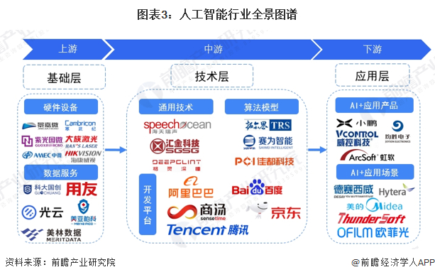 人工智能的生态格局,无论是专用还是通用领域,都围绕“底层-中层-顶层”的技术和产品架构逐渐成形,每一层架构中,都有不同的企业参与,最终形成围绕AI技术,产品和服务的生态圈。