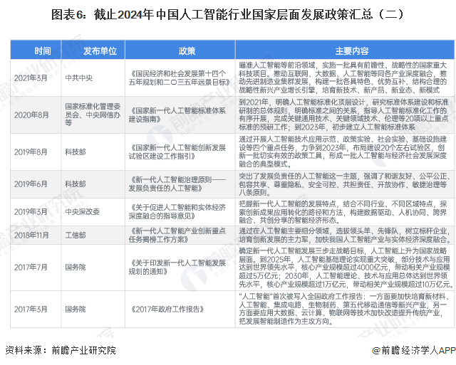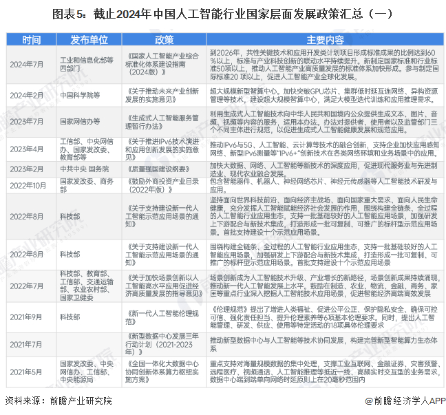 近年来,国家陆续出台多项政策,鼓励人工智能的快速发展创新,加速人工智能与其他产业的融合发展。 从2017年7月国务院印发的《新一代人工智能发展规划》明确指出要“加快人工智能深度应用”到2024年发布的《国家人工智能产业综合标准化体系建设指南(2024版)》等,人工智能产业发展正走向规范化应用。