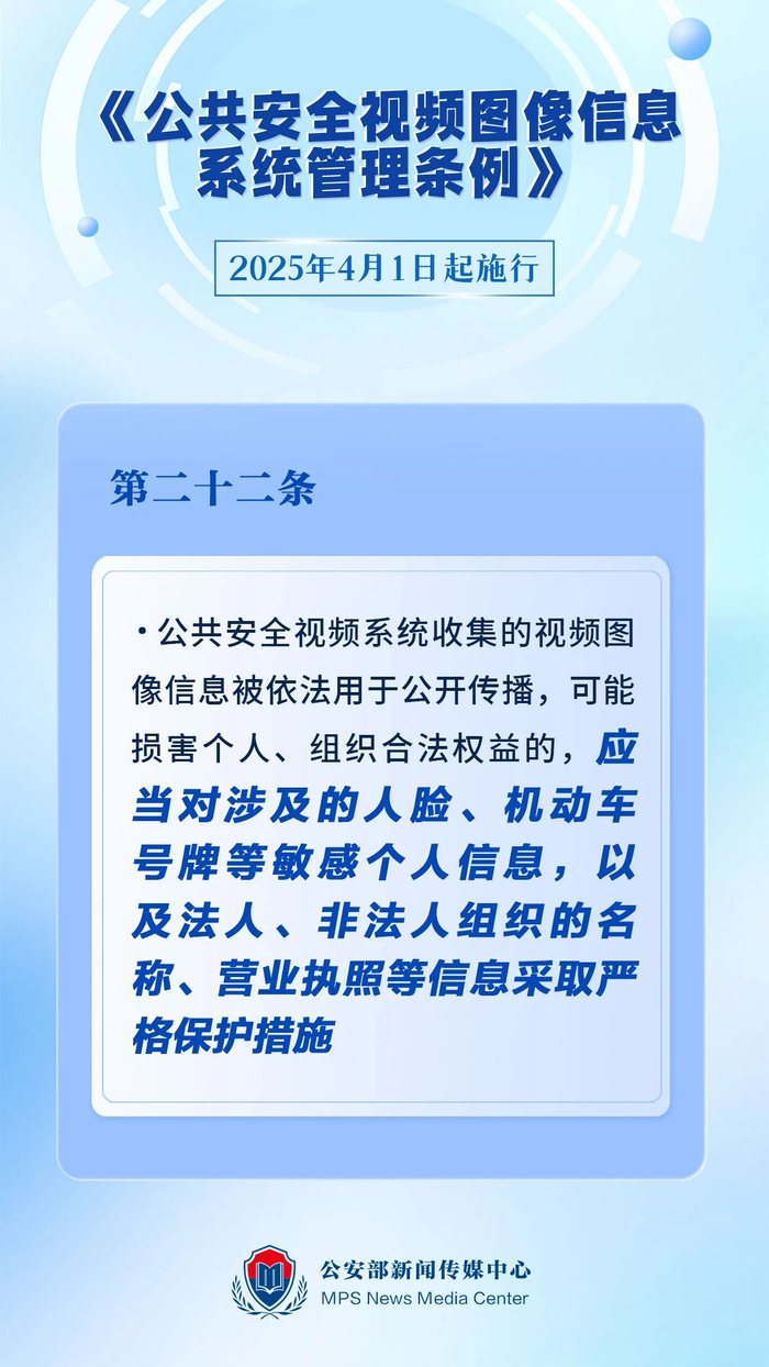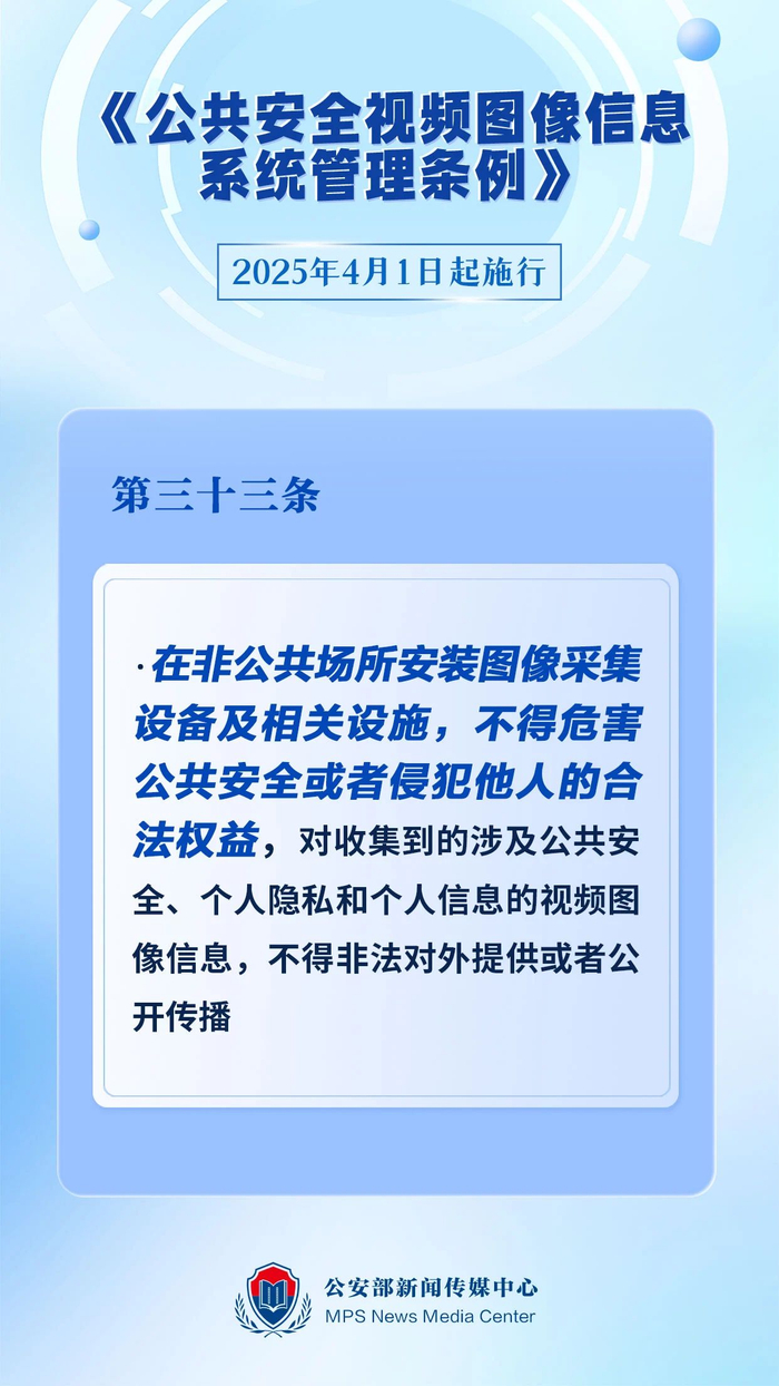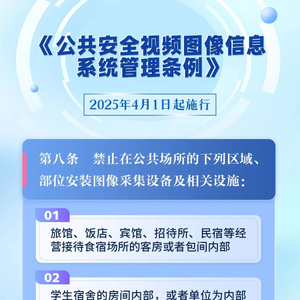 2月12日,公安部新闻传媒中心发布消息,《公共安全视频图像信息系统管理条例》已经2024年12月16日国务院第48次常务会议通过,自2025年4月1日起施行。