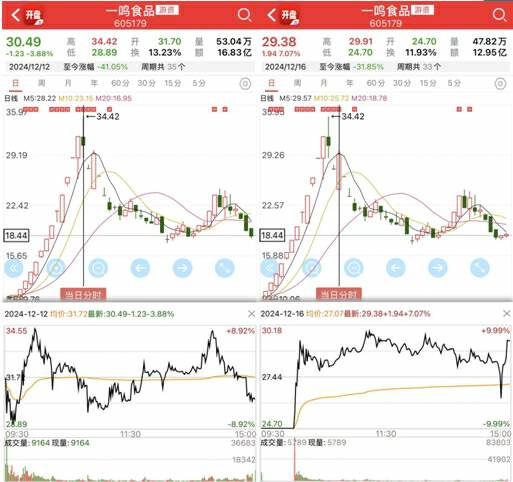 然而更刺激的还在后面。12月13日一鸣食品直接跌停;后一日竞价阶段仍是跌停,但开盘快速拉至红盘,盘中一度又冲到近9个点;但隔日又是一字跌停,18日又躺了个地板。一鸣食品这段A杀中明显有量化参与的痕迹。