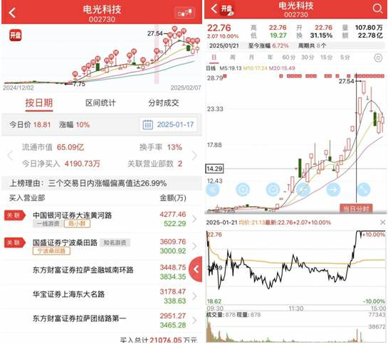 电光科技的情况也类似,1月17日龙虎榜显示陈小群买入4277万(卖出522万),宁波桑田路买入3609万(卖出3000万),量化净卖出;21日电光科技股价几乎全天水下,换手率达23.67%,直到尾盘才勉强回封,陈小群还在格局。