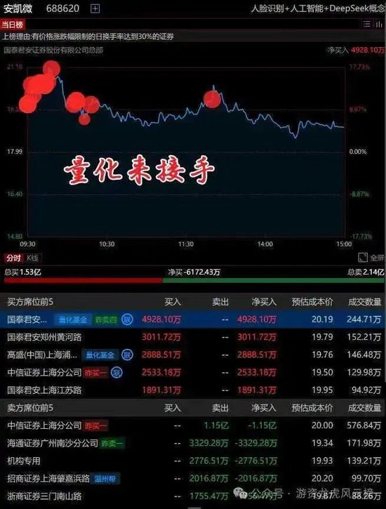 春节后第一周,上证指数重回3300点,两市总成交量拉回近2万亿,游资上亿甚至几亿地买入,但手法上却又是套利。以当前最火的deepseek概念来说,安凯微算是有辨识度的股票之一,2月5日龙虎榜上桑田路出手千万,次日继续追买854万,到了2月7日量化来接手,国泰君安证券总部买入近5000万,高盛(中国)证券上海浦东新区世纪大道买入近3000万,从分时图来看,量化买入点是开盘和盘中的拉升点。