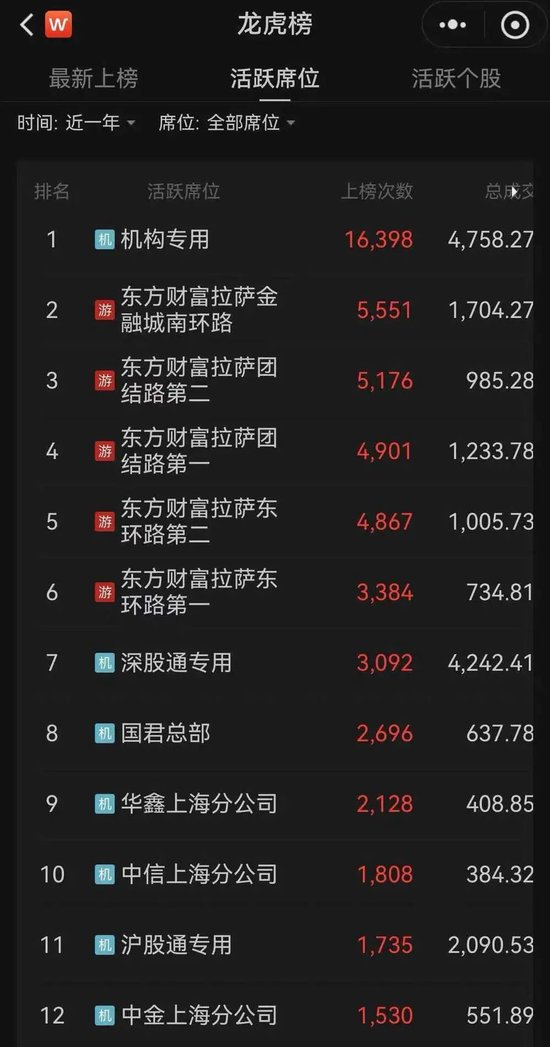 而在近一年中,国君总部、中金上海分公司和华鑫上海分公司等三大量化龙虎榜总成交金额分别高达637.78亿、551.89亿和408.85亿,排名仅次于机构专用、深股通专用等特殊席位以及有“散户大本营”之称的部分东方财富拉萨席位。
