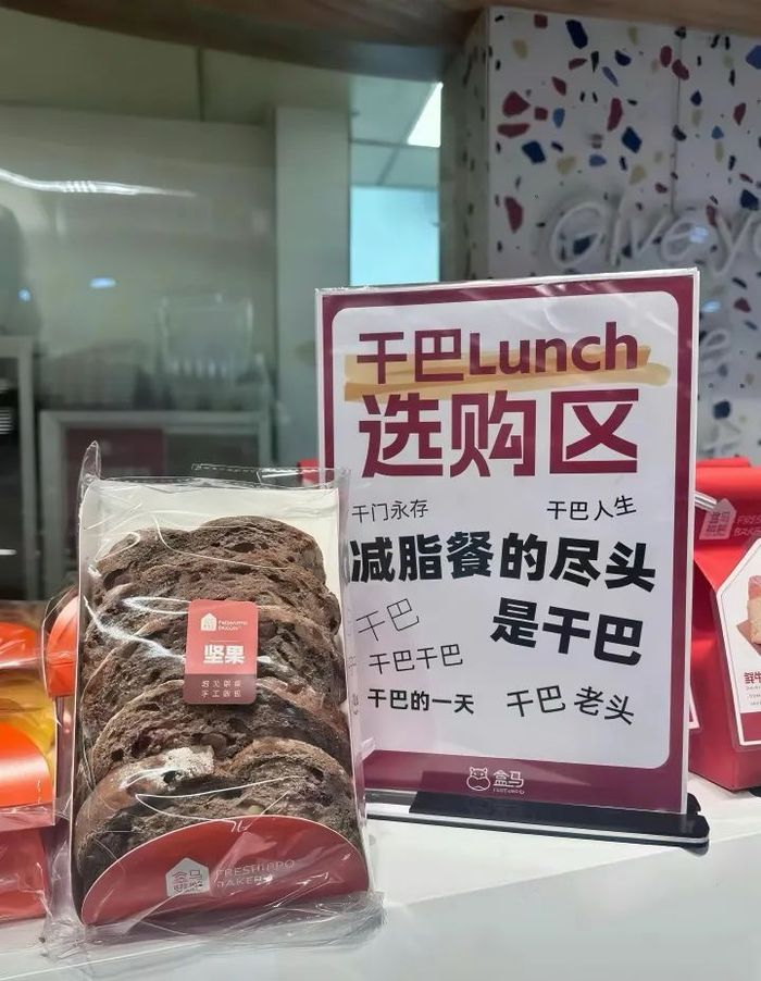 一方面,盒马跟随互联网热点出产品。比如今年社交媒体爆火的“干巴lunch”爆火后,盒马迅速跟进推出了同款“干巴lunch套餐”,包含“干巴”面包、牛油果、三文鱼和黄油。