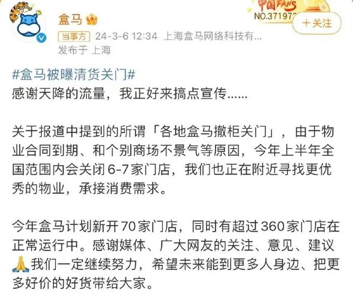 一个明显的现象是,2024年上半年,盒马鲜生陆续关闭6-7家门店,沈阳、海南等地已经“查无此马”。官方给出的原因为:物业到期和商场不景气等。