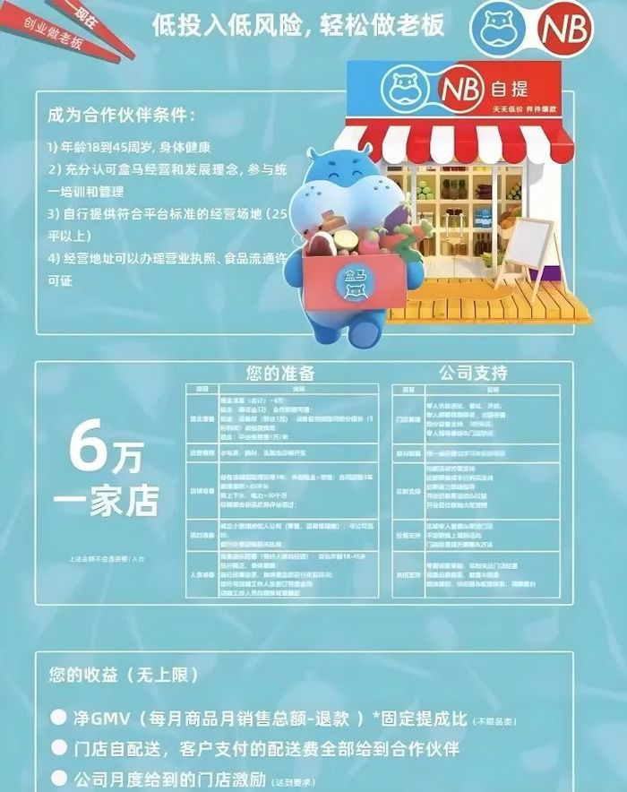 据了解,盒马NB自提店的加盟方式有三种:第一种是独立合作;第二种是异业合作;第三种是团点合作。