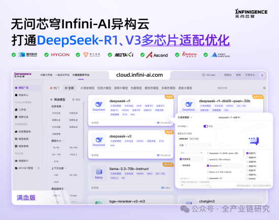 2月11日媒体报道无问芯穹宣布获七家国产芯片支持,正打通DeepSeek-R1、V3在壁仞、海光、摩尔线程、沐曦、昇腾、燧原、天数智芯等七个硬件平台的多芯片适配优化,现开发者已可以通过Infini-AI异构云平台获取DeepSeek系列模型与多元异构国产算力服务。