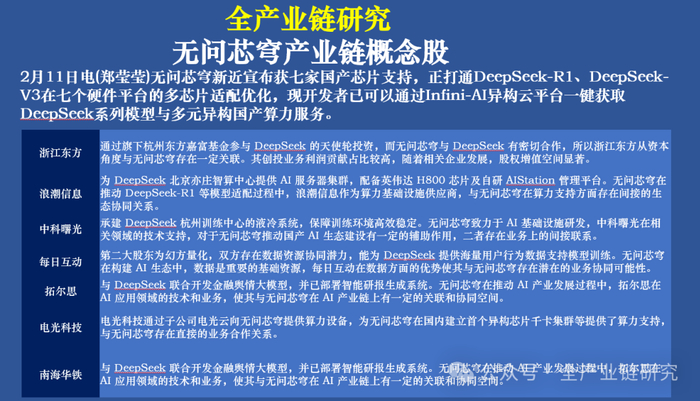 中科曙光:承建 DeepSeek 杭州训练中心的液冷系统,保障训练环境高效稳定。无问芯穹致力于 AI 基础设施研发,中科曙光在相关领域的技术支持,对于无问芯穹推动国产 AI 生态建设有一定的辅助作用,二者存在业务上的间接联系。