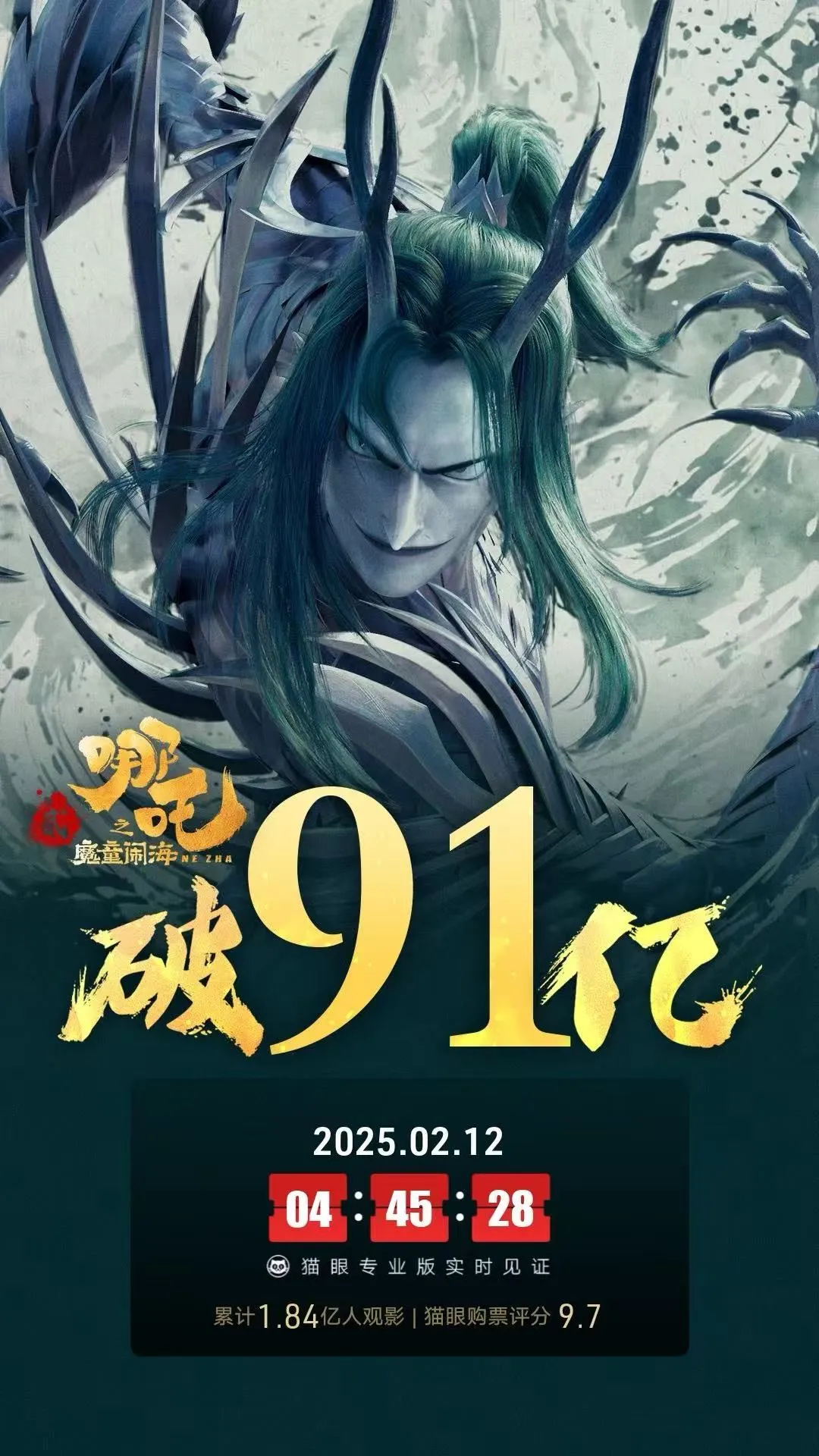 据猫眼专业版数据,截至2025年2月12日04:45,《哪吒之魔童闹海》(《哪吒2》)总票房(含预售)突破91亿元,成为全球影史第27部票房超过90亿元的影片。