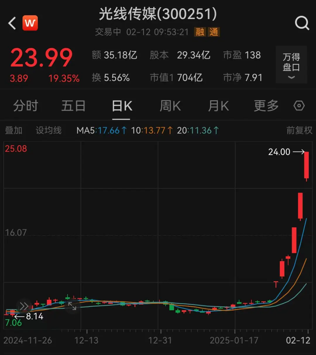延续近日涨势,2月12日,光线传媒开盘继续大涨,一度涨停,目前最新总市值已超700亿元。