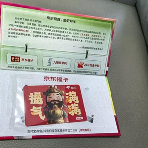 卡片外面用纸套包装,上面写着:“京东携手各大平台响应国家惠民补贴,在5亿用户中随机抽取您为幸运用户,为您奉上诚挚的新春大礼包,分别为:京东福卡,九阳豆浆机,以及20元的新年红包,响应惠民补贴,感恩我们的每一位用户。”首页末尾还标注:“所有礼品由京东包邮到家,无需任何费用。现金补贴联系客服领取,现金直接发放到您的支付宝。”