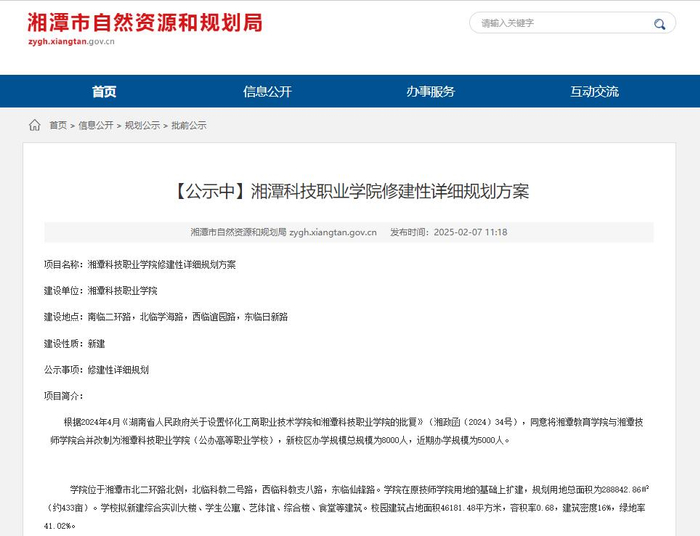 经济观察网讯 近日,湘潭市自然资源和规划局公示《湘潭科技职业学院修建性详细规划方案》。根据2024年4月《湖南省人民政府关于设置怀化工商职业技术学院和湘潭科技职业学院的批复》,同意将湘潭教育学院与湘潭技师学院合并改制为湘潭科技职业学院(公办高等职业学校),新校区办学规模总规模为8000人,近期办学规模为5000人。《方案》显示,学院在原技师学院用地的基础上扩建,规划用地总面积为288842.86㎡(约433亩)。学校拟新建综合实训大楼、学生公寓、艺体馆、综合楼、食堂等建筑。校园建筑占地面积46181.48平方米。