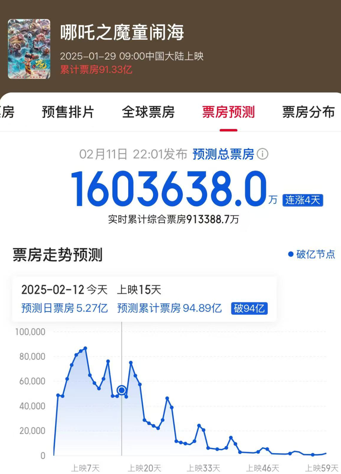 据猫眼专业版数据,截至2025年2月12日04:45,《哪吒之魔童闹海》(《哪吒2》)总票房(含预售)突破91亿元,成为全球影史第27部票房超过90亿元的影片。