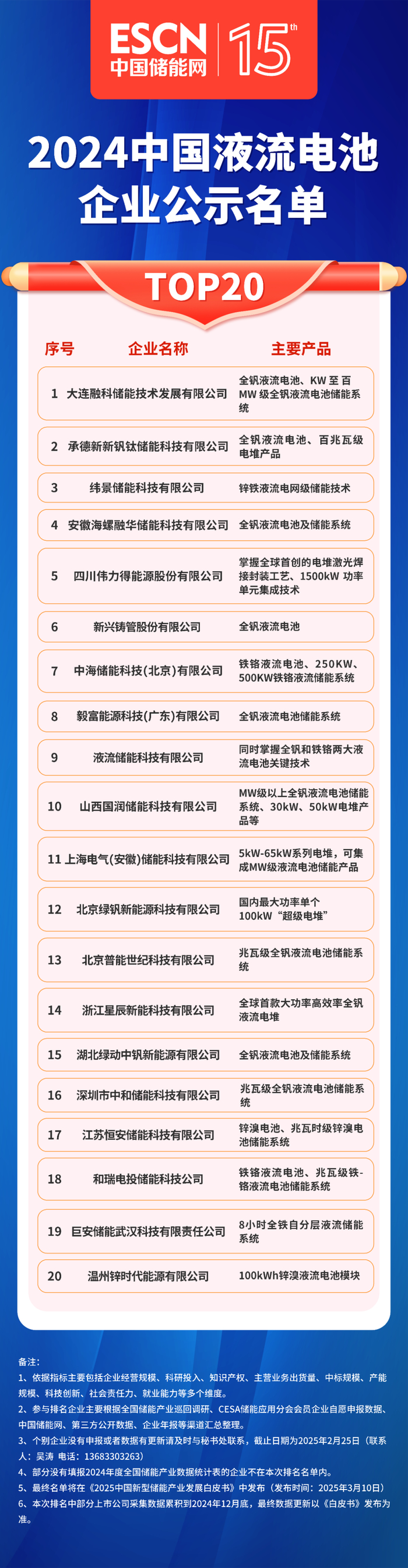 以下为2024中国新型储能液流电池企业TOP10公示名单