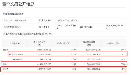 深交所2月11日披露的竞价交易公开信息显示,在2025年2月5日至2025年2月11日股价严重异常波动期间,光线传媒中小投资者累计买入占比47.18%,累计卖出占比38.71%;相较之下,上述时间区间内,机构累计买入占比16.98%,累计卖出占比28.84%。