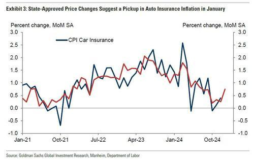 ②汽车保险。高盛预计1月份车险价格将加速上涨:+0.75%(12月份为+0.40%),反映出该行在线数据集显示的保费上涨。汽车价格上涨、维修成本以及医疗和诉讼成本都给保险公司带来了涨价的压力,但保费被转嫁给消费者,这需要很长的滞后,部分原因是保险公司必须与州监管机构协商涨价。
