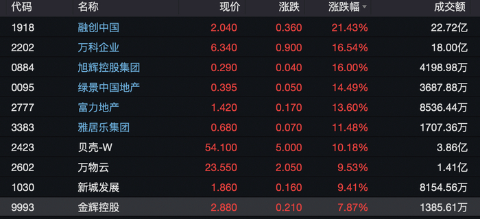 港股方面,截至收盘,融创中国涨超21%,万科企业涨幅在16%以上,旭辉控股、绿景中国、富力地产、贝壳等6只股票涨幅在10%以上。新城发展、龙湖集团、华润置地、中国金茂、龙光、越秀地产等亦录得5%以上的涨幅。整体来看,地产建筑业板块涨幅约4.3%,领涨各大板块。