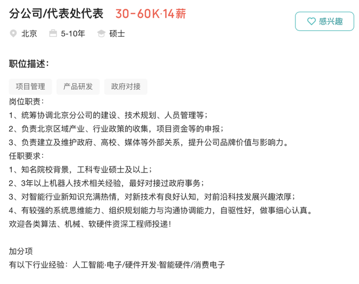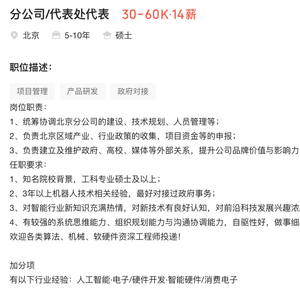 根据招聘平台,分公司代表的岗位职责为统筹协调北京、上海分公司的建设、技术规划、人员管理等;负责北京、上海区域产业、行业政策的收集,项目资金等的申报;负责建立及维护政府、高校、媒体等外部关系,提升公司品牌价值与影响力。