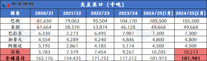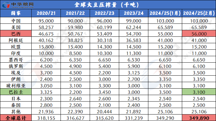 产量下调:2024/25年度全球大豆产量预计为4.208亿吨,较上月下调350万吨,其中南美三国(阿根廷、巴西和巴拉圭)产量调低到2.287亿吨。由于1月份持续高温干燥,阿根廷和巴拉圭的产量下调。巴西大豆产量保持不变,仍为1.69亿吨。巴西中西部的有利天气提振大豆产量前景,但南部的干燥天气加速大豆作物生长,但牺牲单产潜力。