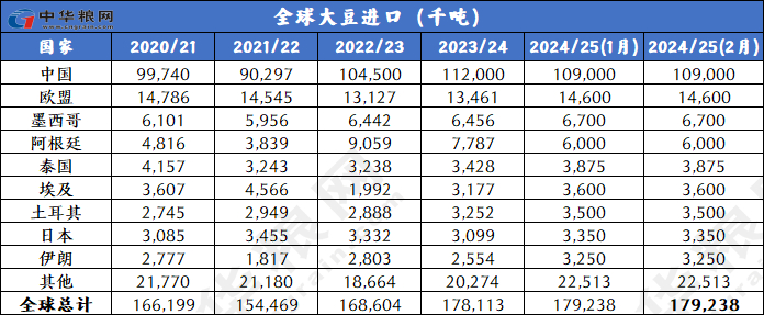 出口上调:2024/25年度全球大豆出口基本维持不变,为1.8198亿吨,全球大豆进口预测保持不变。