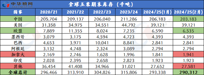 库存下调:2024/25年度全球玉米期末库存预计2.903亿吨,较上月调低300万吨。美国以外地区的玉米期末库存下调,因为中国的库存调低300万吨。