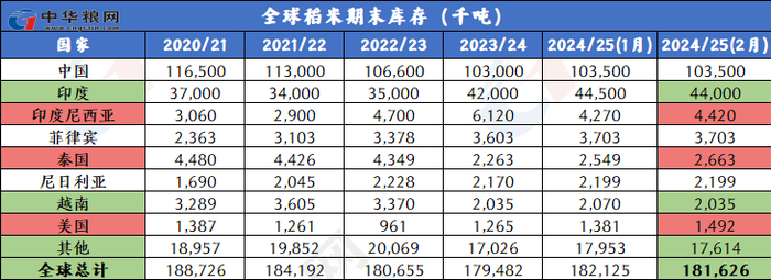 库存下调:2024/25年度全球大米期末库存下调至1.816亿吨,较上月调低50万吨,主要是由于印度和斯里兰卡的库存降幅超过包括美国在内的几个国家的库存增幅。