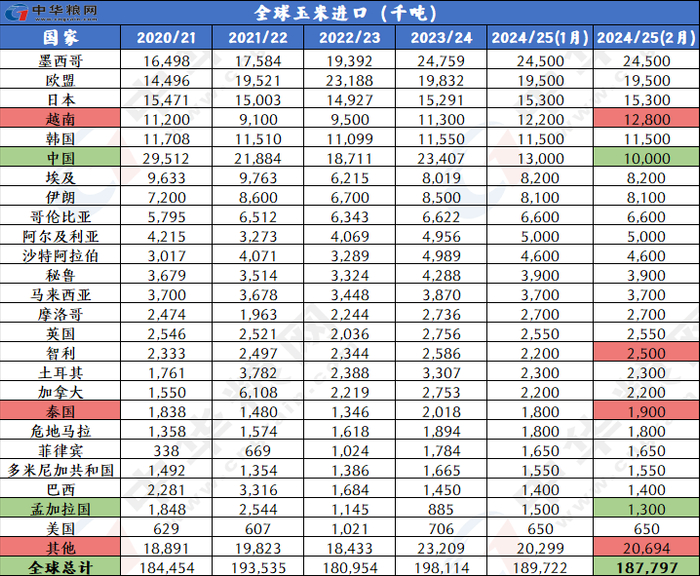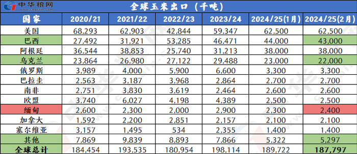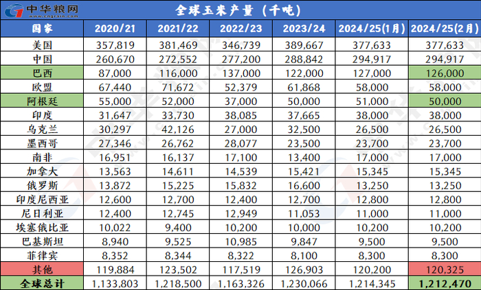 产量下调:2024/25年度全球玉米产量下调约188万吨,达到12.125亿吨,主要因为阿根廷和巴西的产量调低。阿根廷产量下调反映出单产调低,因为1月至2月初的高温和干燥降低了中部主产区早播玉米的单产潜力。巴西玉米产量预测下调,因为中西部二季玉米种植进展缓慢降低单产前景。