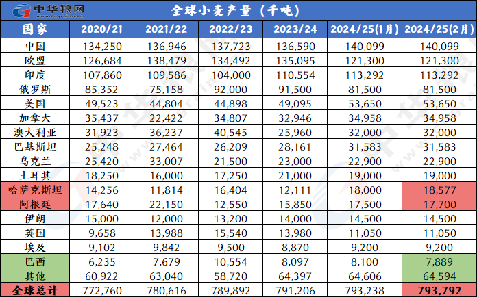 产量上调:2024/25年度全球小麦产量微幅上调55万吨,至7.938亿吨,比上年增长258万吨,主要是因为哈萨克斯坦和阿根廷的产量调高。