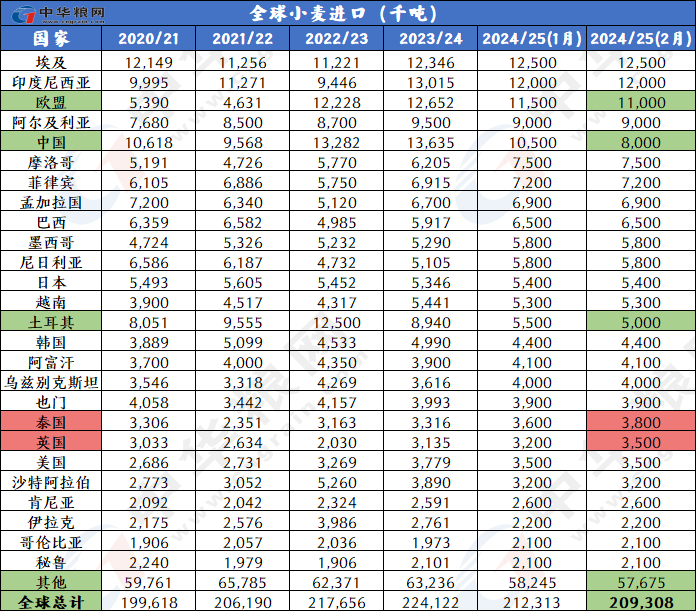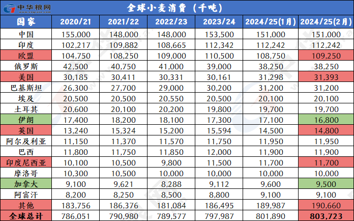 进出口下调:2024/25年度全球小麦进出口量为2.093亿吨,较上月下调300万吨。出口方面主要是欧盟、俄罗斯和乌克兰的出口下调,欧盟的出口量预计为2800万吨,比上个月下调100万吨;进口方面,调整幅度最大的是中国,进口调低至五年最低800万吨,较上月调低250万吨,因为进口速度持续缓慢,比上年减少564万吨。
