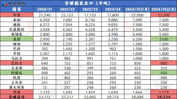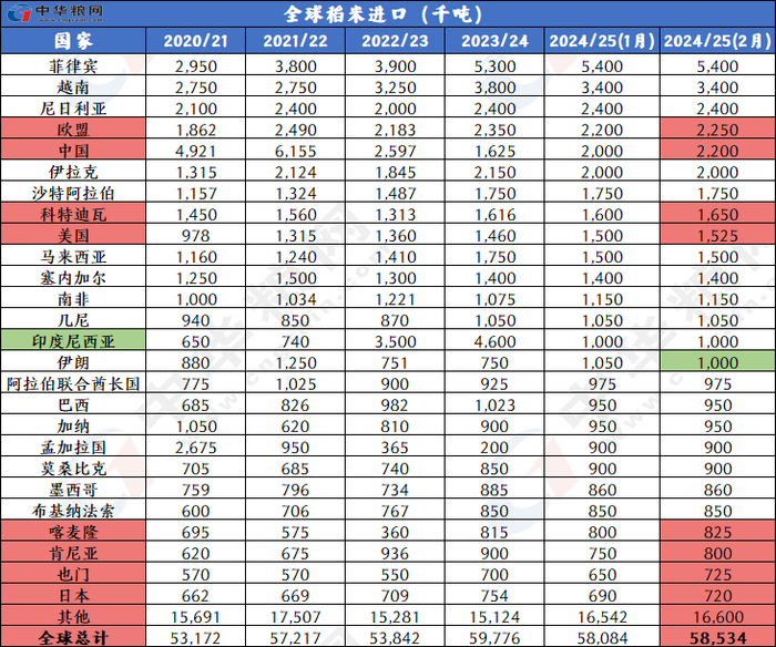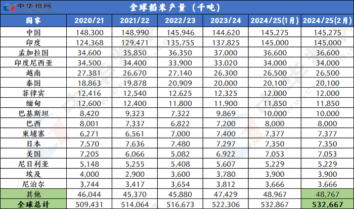 产量下调:2024/25年度全球大米产量相比上月微幅下调约20万吨,达到5.327亿吨,主要是由于斯里兰卡产量下调。