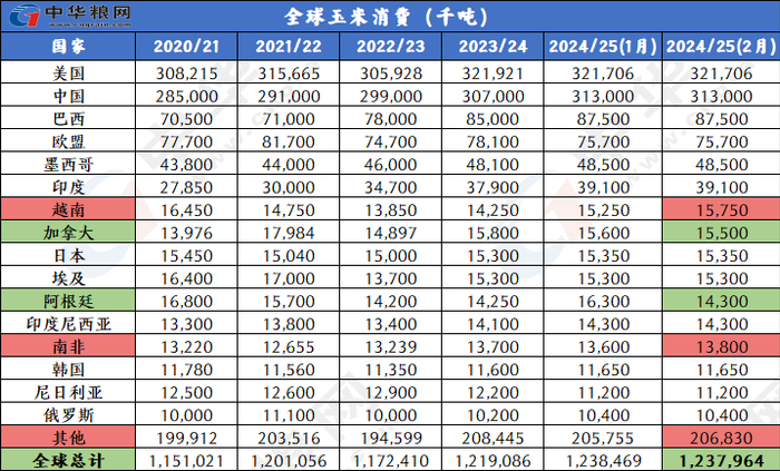 消费下调:2024/25年度全球玉米消费量下调50万吨,达到12.38亿吨,其中主要是阿根廷的消费量大幅下调,因为阿根廷国内饲料用量调低200万吨。
