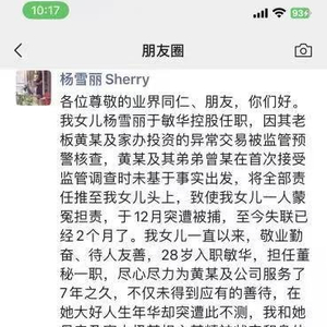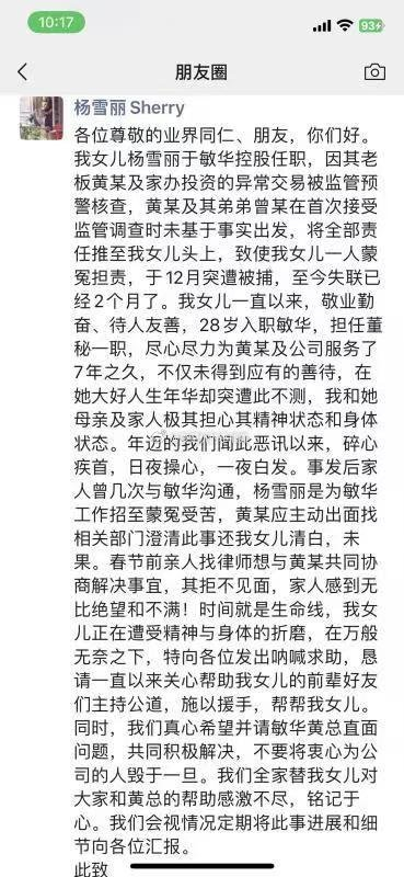日前,一则疑似敏华控股(01999.HK)前IR杨雪丽父母用其账号发布的朋友圈截图在网络流传。其中提到,杨雪丽在敏华控股任职多年,因老板黄某及家办投资的异常交易被监管预警核查,黄某及其弟弟曾某在接受监管调查时将责任推给杨雪丽,导致其在2024年12月被捕失联。