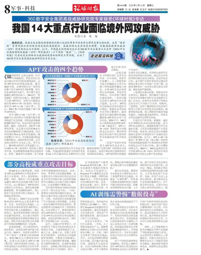 编者的话:随着全球互联的趋势持续加强以及国际事务中的竞争与博弈态势日趋加剧,具有“国家级”背景的组织在网络空间发起的高隐蔽性、高破坏性攻击活动更加频繁,防备高级持续性威胁(APT)的重要性也与日俱增。11日,中国最大的网络安全公司360数字安全集团正式发布《2024年全球高级持续性威胁(APT)研究报告》(以下简称“报告”),《环球时报》记者就近来网络安全威胁的趋势和防御重点等问题,采访了360数字安全集团高级威胁研究院专家边亮。