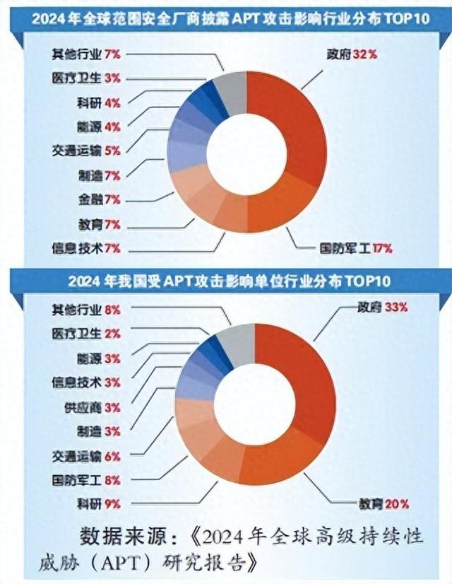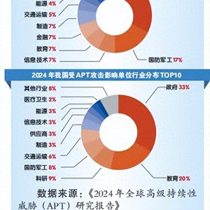 据360安全大模型监测,我国受APT攻击影响单位主要涉及14个重点行业领域,其中,政府机构、教育、科研、国防军工和交通运输是遭受APT攻击活动最为集中的5个行业。这主要是由于APT组织针对特定行业的攻击,通常实施窃取敏感数据,甚至战略性破坏,用以服务于攻击者背后势力的政治、军事或经济等目的。