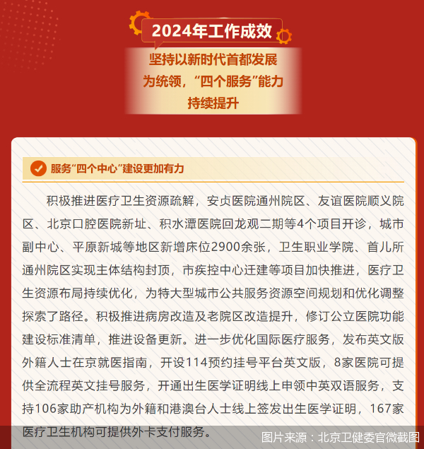 此外,北京进一步优化国际医疗服务,发布英文版外籍人士在京就医指南,开设114预约挂号平台英文版,8家医院可提供全流程英文挂号服务,开通出生医学证明线上申领中英双语服务,支持106家助产机构为外籍和港澳台人士线上签发出生医学证明,167家医疗卫生机构可提供外卡支付服务。