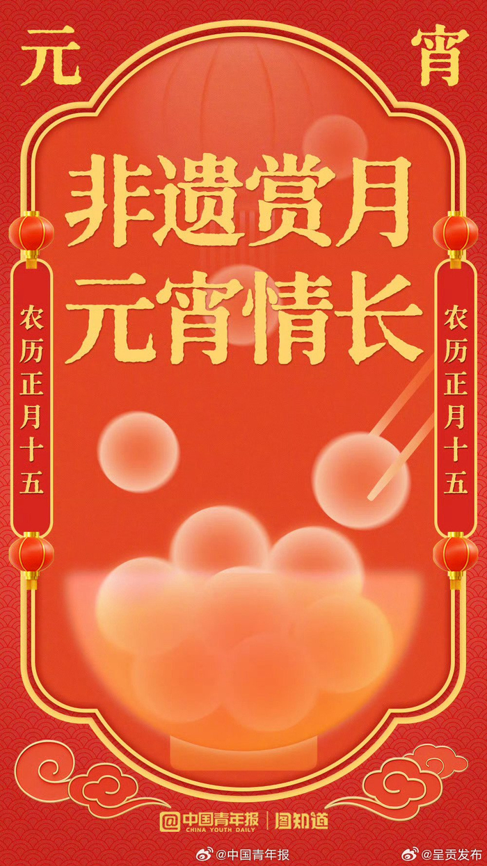 2月12日是元宵佳节,也是乙巳蛇年第一个月圆之夜。今年的元宵月是“十五的月亮十五圆”,最圆时刻出现在12日21时53分。赏月团圆,非遗作伴。全国各地有哪些和元宵有关的非遗?快来跟着非遗闹元宵,一起发现非遗中的“圆”气满满。#青春文化中国行# @中国青年报