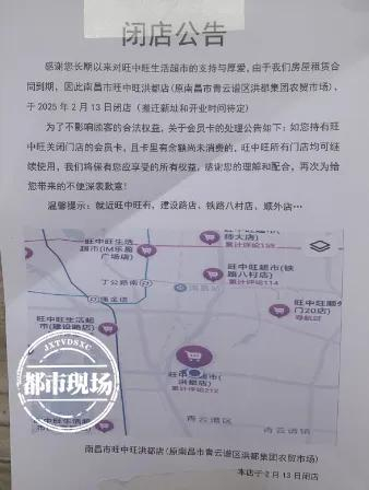 2月5日下午,都市现场记者来到了南昌市青云谱区新溪桥路的旺中旺生活超市(洪都店),超市入口处已经张贴了《闭店公告》,原文如下: