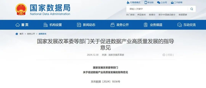 在数字化浪潮席卷全球的今天,数据已成为国家发展的核心资源和战略资产。12月30日,国家发展改革委联合国家数据局、教育部、财政部、金融监管总局、中国证监会等部门发布《国家发展改革委等部门关于促进数据产业高质量发展的指导意见》(以下简称《指导意见》),旨在深化数据要素市场化配置改革,构建以数据为关键要素的数字经济,推进国家大数据战略,加快建设数字中国。