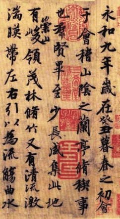 永和九年三月初三,会稽太守王羲之,邀谢安、孙绰等41位当朝军政大员及社会名流,于会稽山阴兰亭(今浙江绍兴城外兰渚山下)举行修禊雅集。与会者曲水流觞,饮酒赋诗,各抒胸襟,共作诗37篇。其中11人各成2篇,15人各成1篇,16人作不出诗,各罚酒3觥。事后将诗篇抄录成集,名《兰亭集》。与会者公推雅集召集人王羲之作序,记录雅集盛况。王羲之用蚕茧纸、鼠须笔,乘兴挥毫泼墨,一气呵成千古名篇《兰亭(集)序》。这酒后微醺之作,记叙兰亭周围山水之美和聚会的欢乐之情,抒发作者对于生死无常的感慨,不仅成为收入《古文观止》的名篇,还成为书法史上无法逾越的丰碑——天下行书第一。