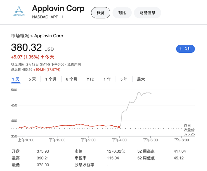Applovin周三收盘上涨1.35%,报380.32美元。良好业绩加上超出预期的业绩指引,刺激AppLovin股价盘后一度大涨近30%。该公司股价去年狂飙700%,主要受益于其人工智能驱动的广告系统。