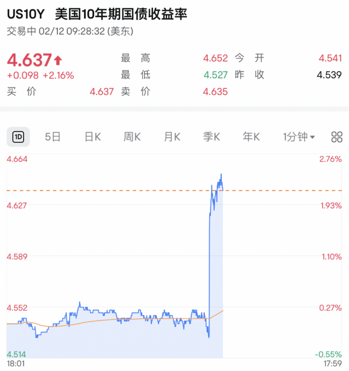 受此影响,美元指数直线拉升,其他非美货币全线下挫。美国国债市场亦遭遇大幅抛售,与利率预期密切相关的美国2年期国债收益率一度跃升至4.37%,美国10年期国债收益率亦直线拉升。