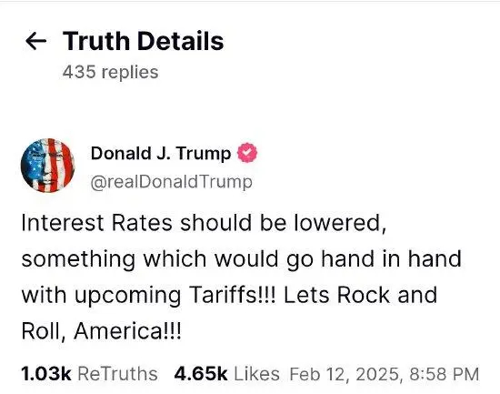 美国总统特朗普将1月通胀抬头归咎为“拜登通胀”,他在社交平台声称“拜登通胀上升!”此外,特朗普还表示,利率应该降低,这与即将到来的关税是相辅相成的。