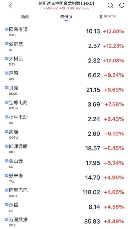 值得一提的是,中概股逆势走强,纳斯达克中国金龙指数涨1.62%,房多多大涨超21%,贝壳涨超7%,富途控股涨超6%,阿里巴巴涨超4%,理想汽车涨超3%,百度、小鹏汽车、哔哩哔哩等涨超2%,网易、蔚来等涨超1%。另外,3倍做多富时中国ETF大涨超4%,2倍做多中国互联网股票ETF大涨超3%。