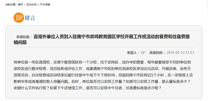 来信标题: 咨询外单位人员到入驻南宁市武鸣教育园区学校开展工作或活动的餐费和住宿费报销问题